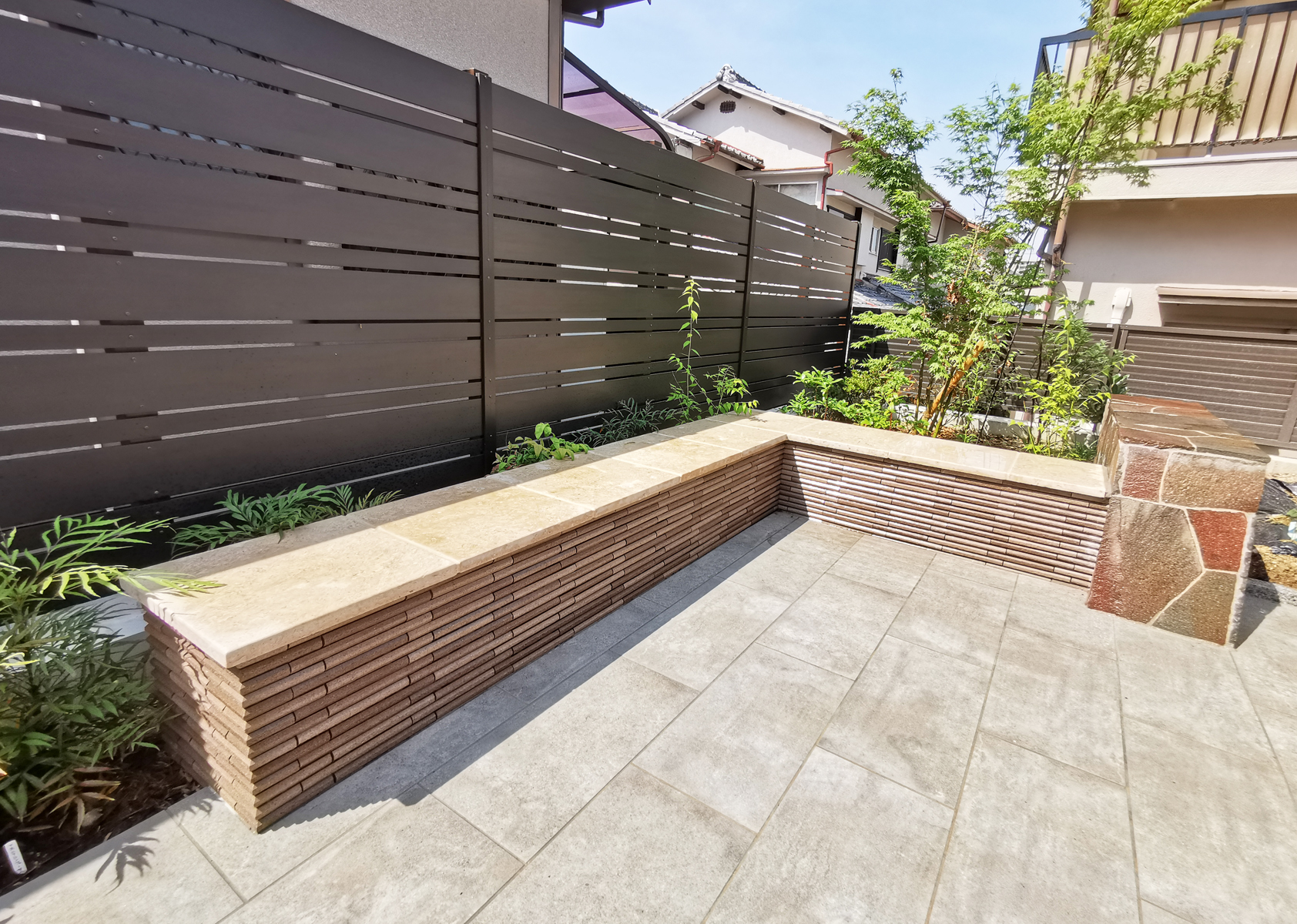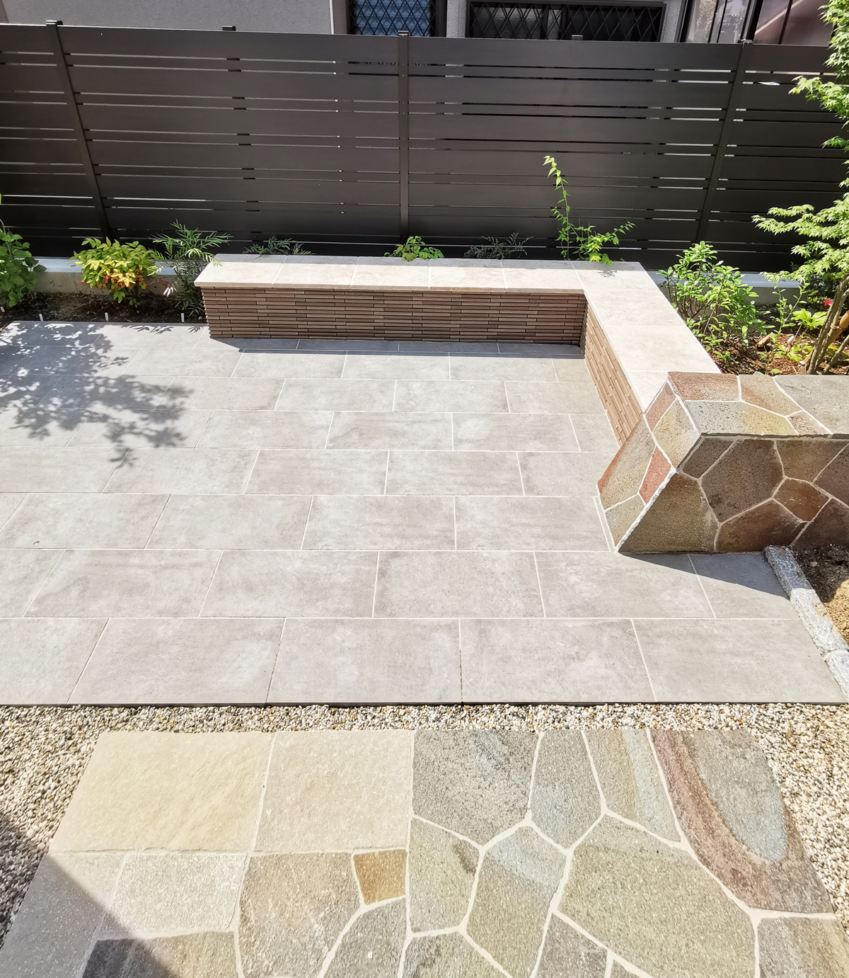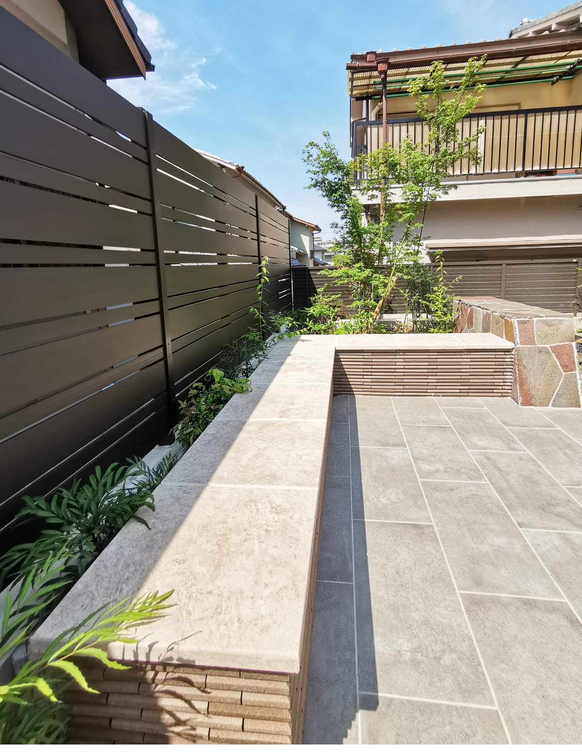 TITLE波や磯に見立てた和モダンの庭~吹田市 ガーデン 波や磯に見立てたモダン和風の庭。 凪の水平線を意識して横方向へのライン取りを大切にデザインしました。 濃淡のあるベンチの横ボーダータイルは柔らかいしぶきに見立てています。 フェンスもシンプルに間隔を変えることで、透過した光でより水平線が意識されます。 磯に見立てた乱張りのアクセントはサイドテーブルの代わりにも利用できます。