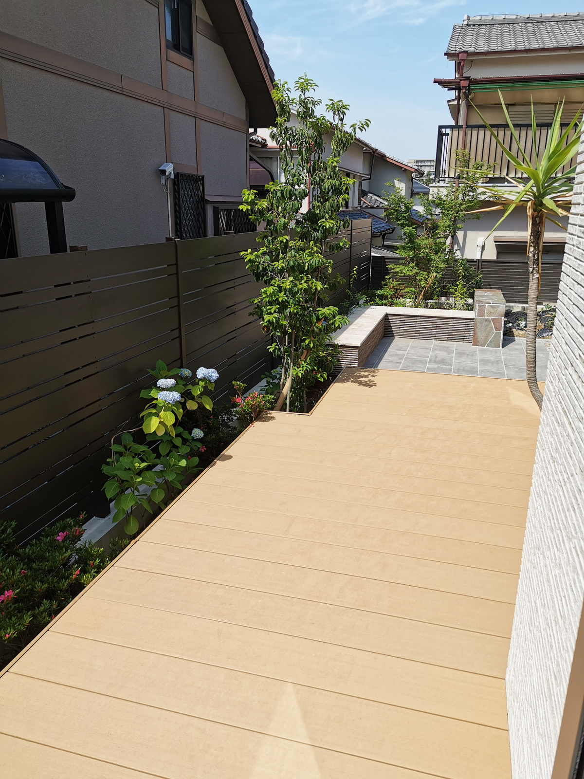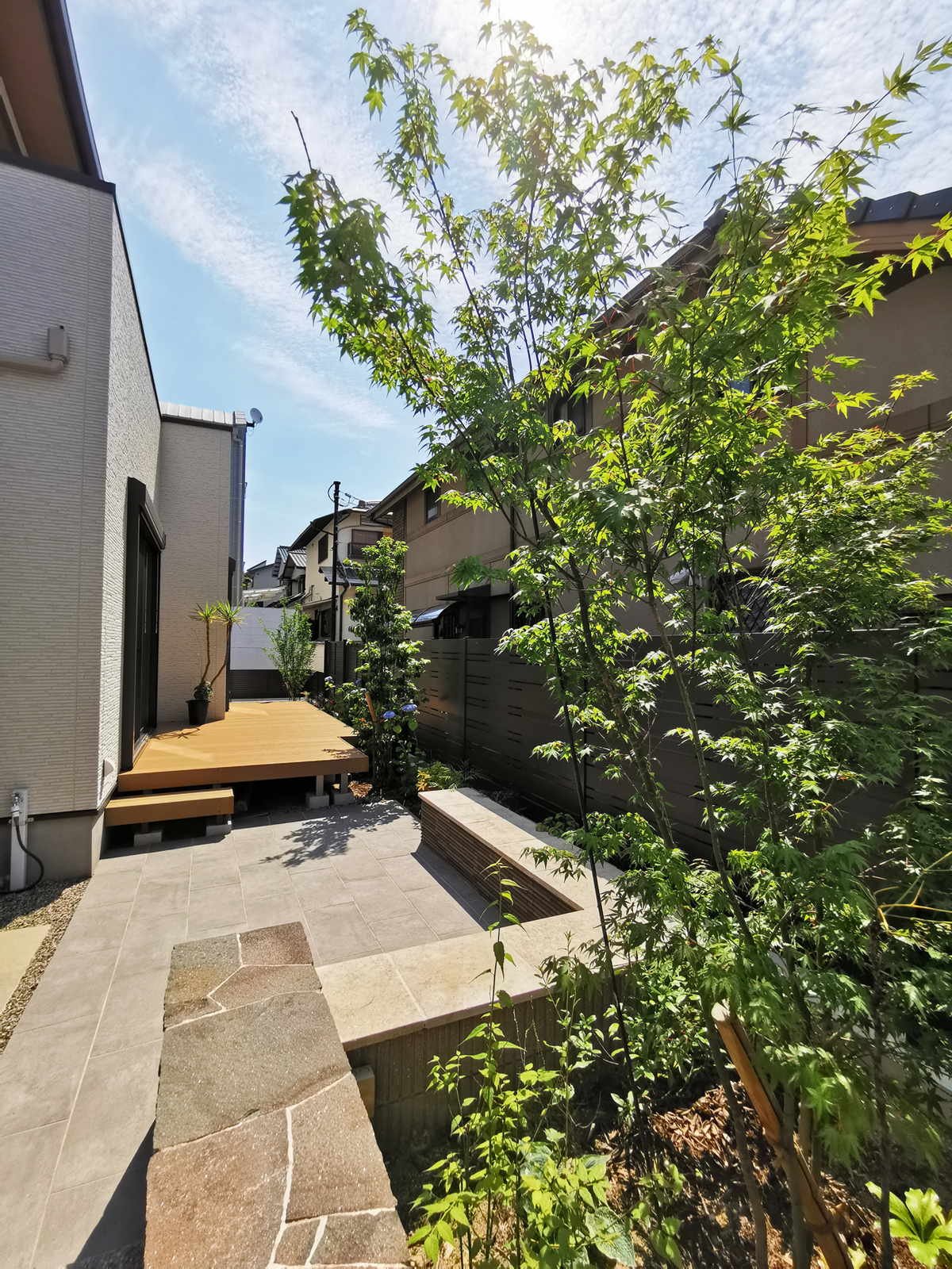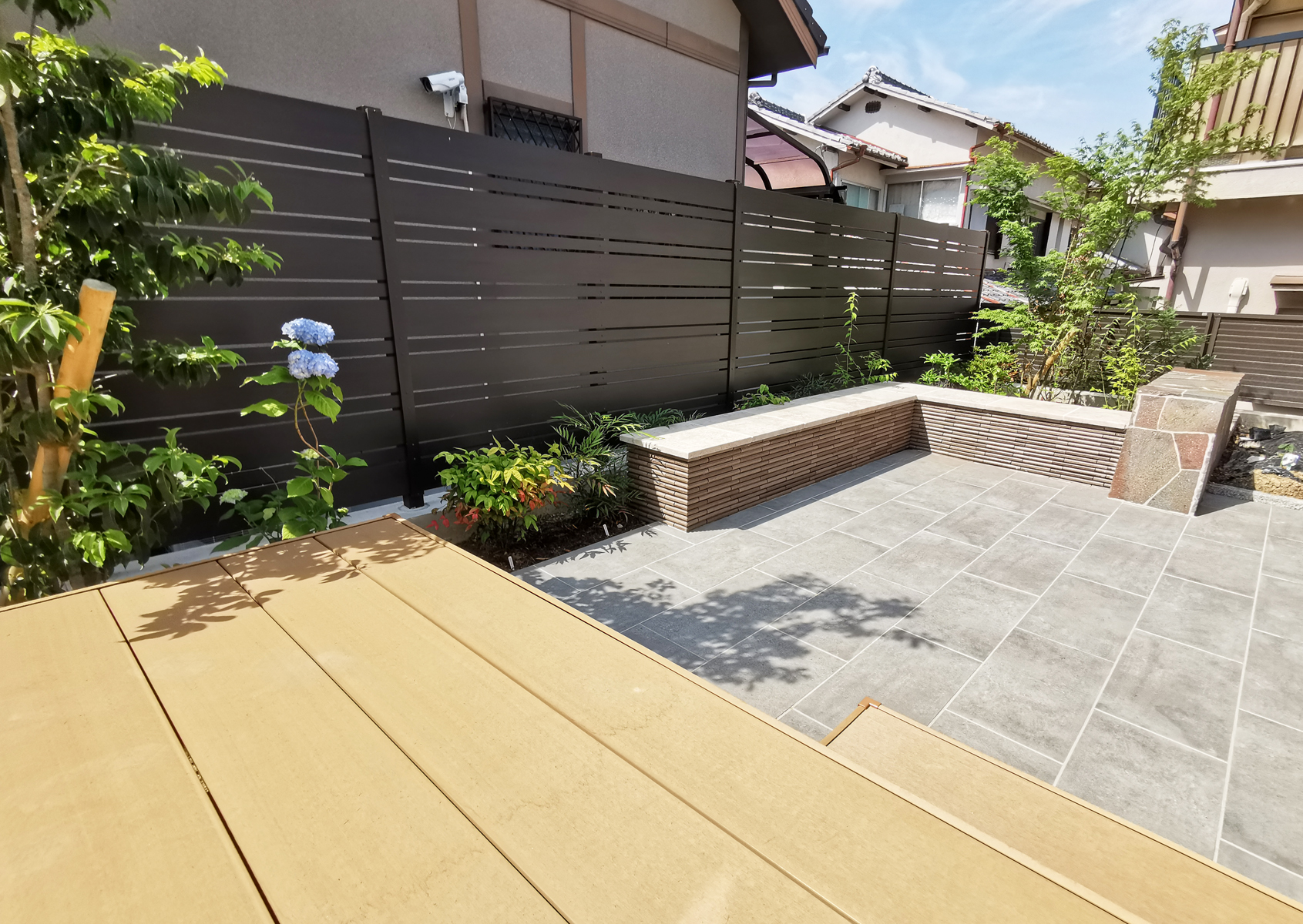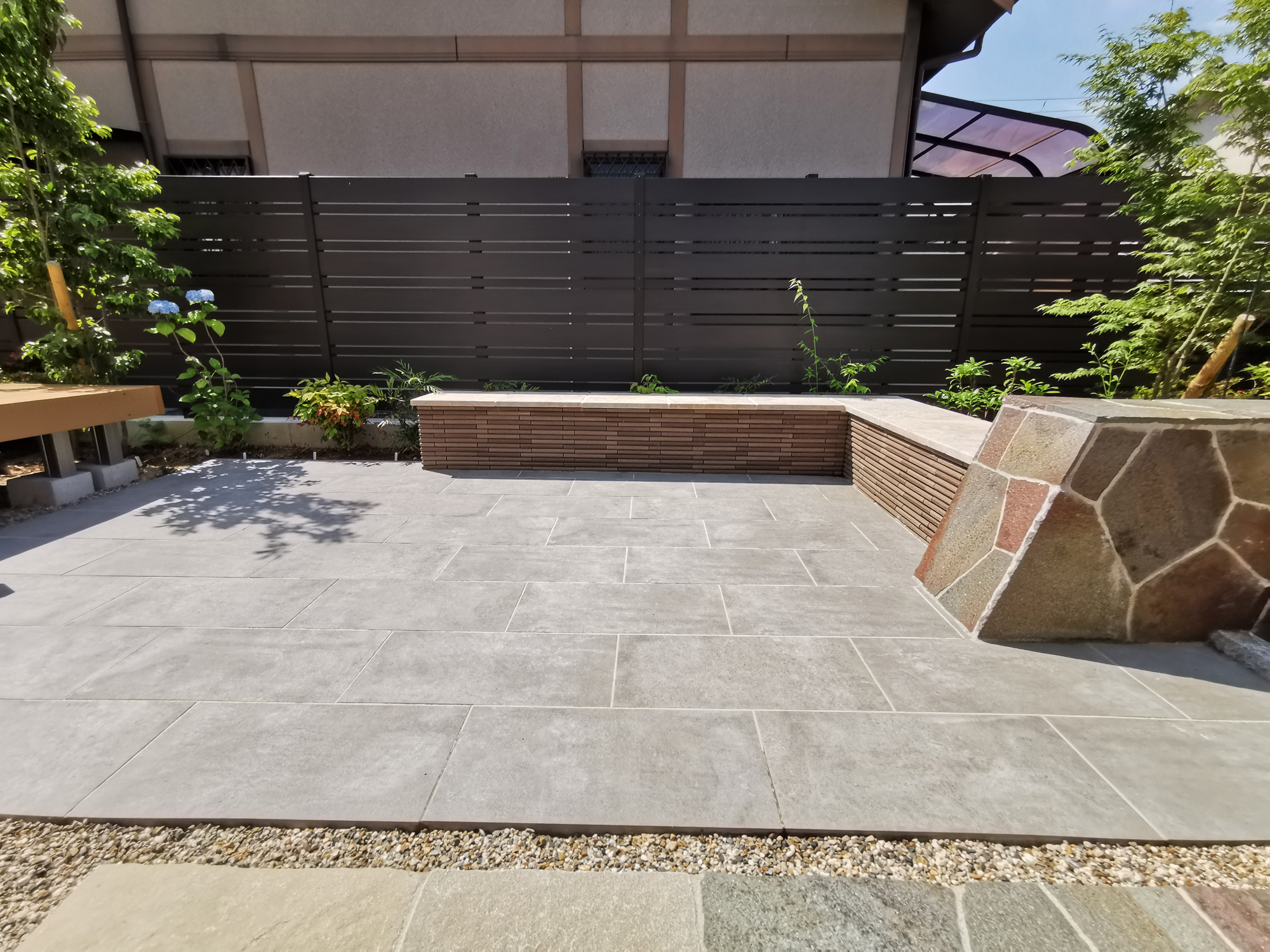 TITLE波や磯に見立てた和モダンの庭~吹田市 ガーデン 波や磯に見立てたモダン和風の庭。 凪の水平線を意識して横方向へのライン取りを大切にデザインしました。 濃淡のあるベンチの横ボーダータイルは柔らかいしぶきに見立てています。 フェンスもシンプルに間隔を変えることで、透過した光でより水平線が意識されます。 磯に見立てた乱張りのアクセントはサイドテーブルの代わりにも利用できます。