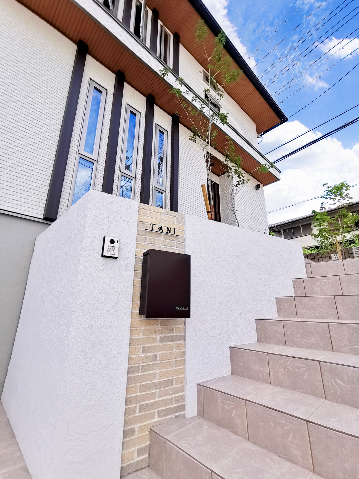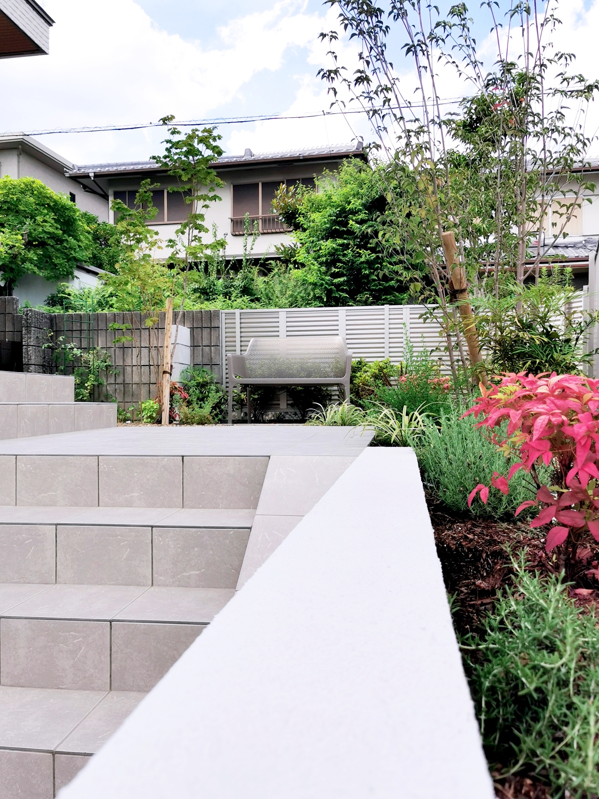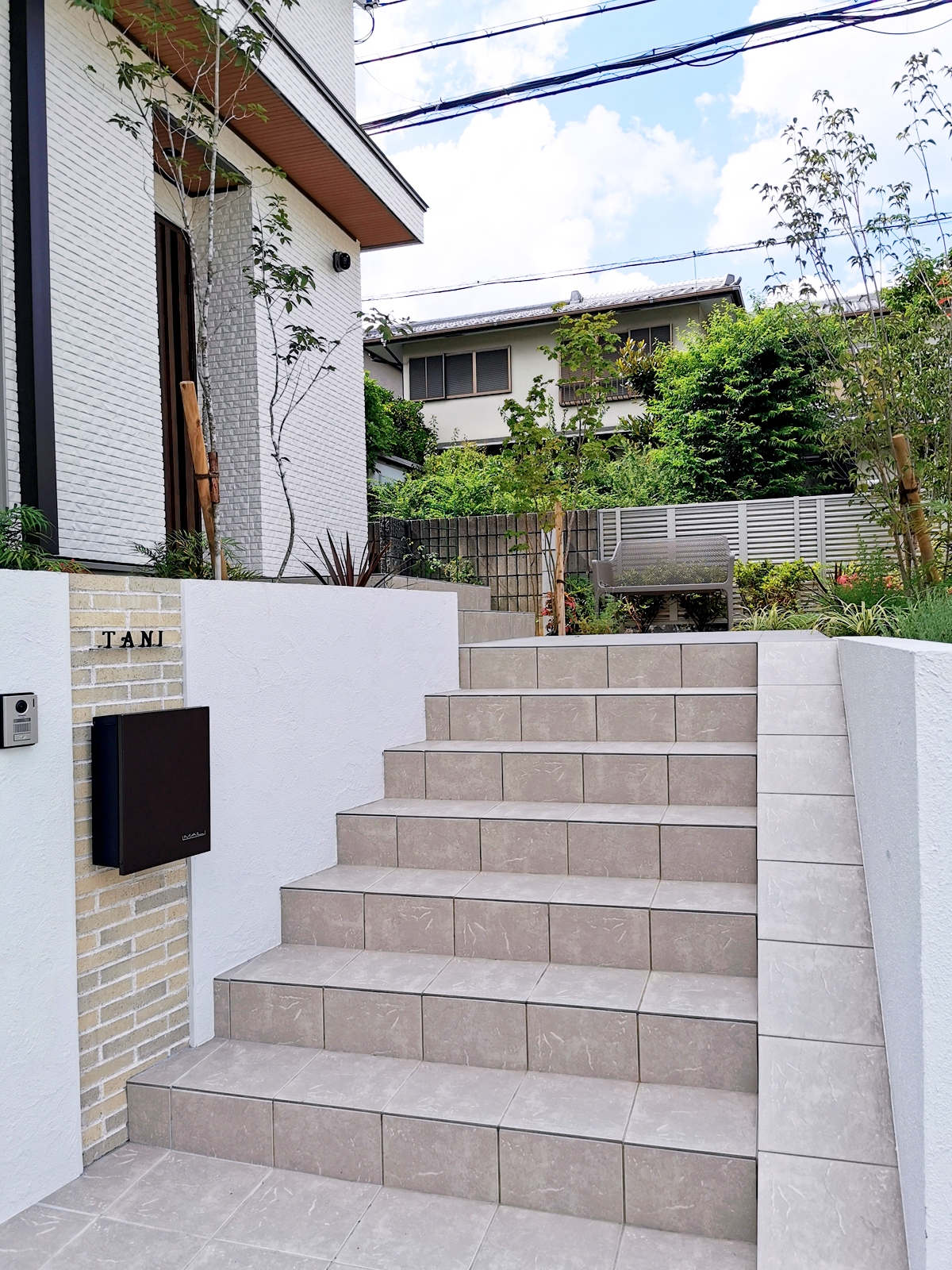 TITLE空に伸びる縦のラインを活かした外構~吹田市 エクステリア 建物の綺麗な縦ライン。それに調和するように縦ラインを強調した門壁にしています。 敷地に高低差があるので、門壁上部にシンボルツリーを配植し、夜間もライトアップして帰宅を迎えてくれます。 階段の幅を広げ、玄関までのアプローチに余裕を持たせるとともに、玄関前のスペースに前庭を作ってベンチを設置し、見ても楽しめる景色、ちょっとしたご近所さんの訪問にも応接できる場所にしています。