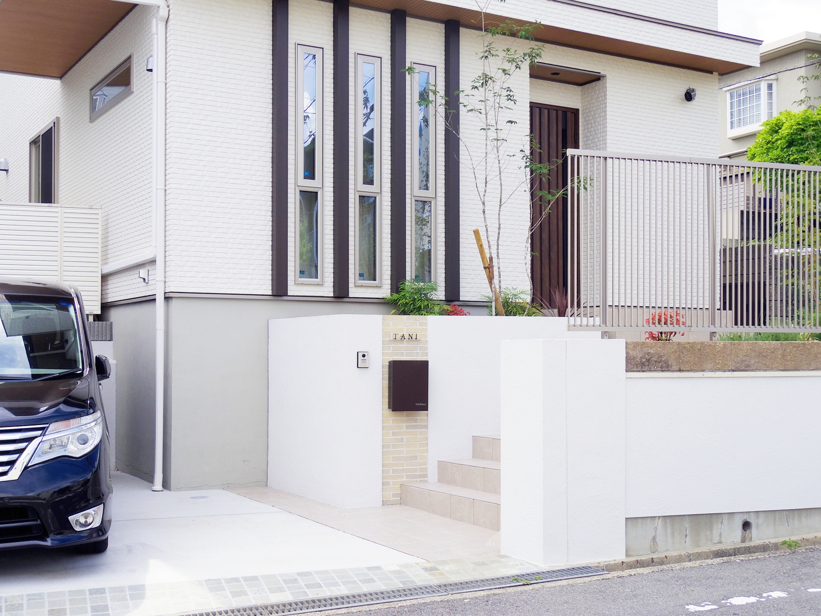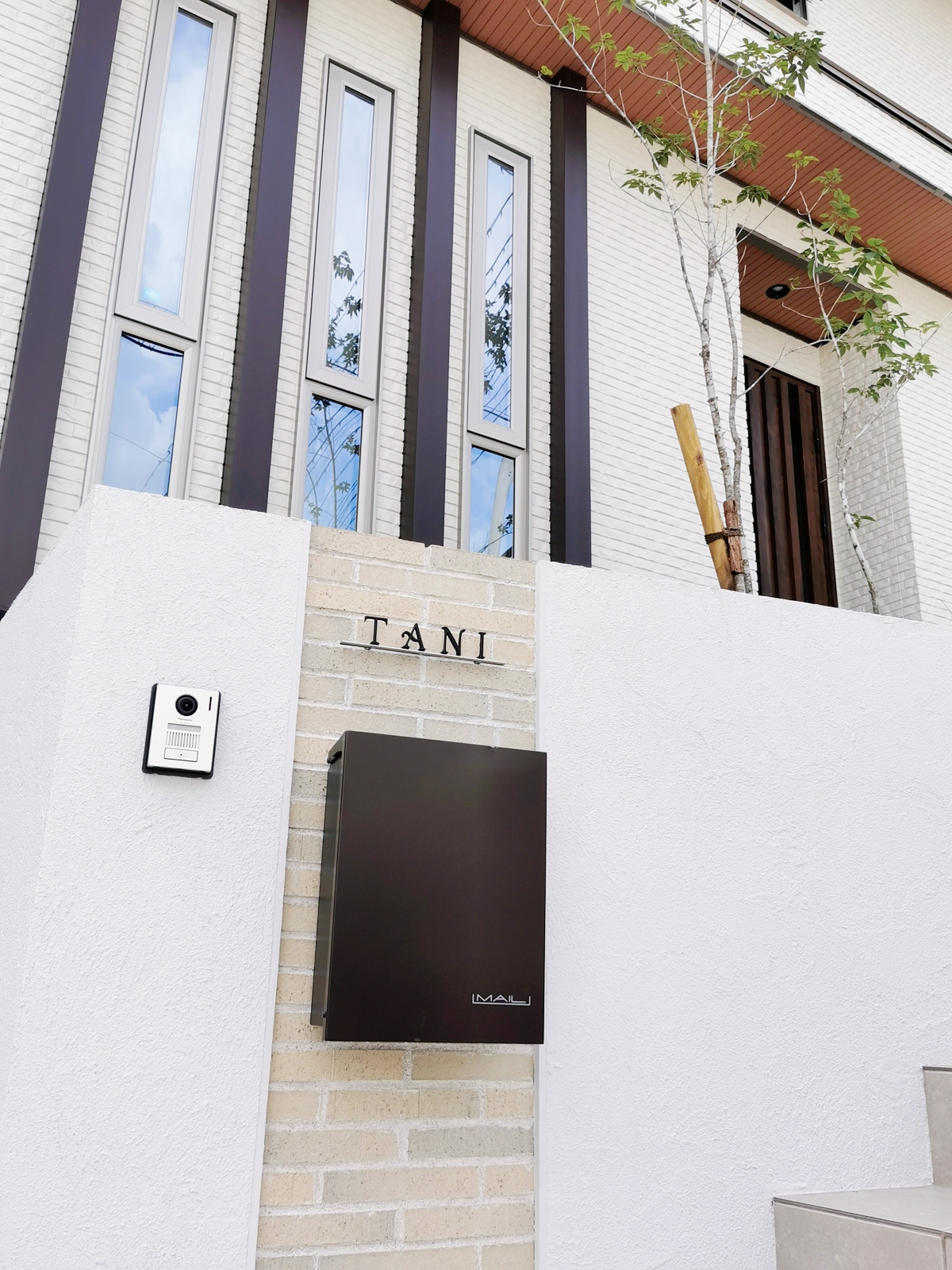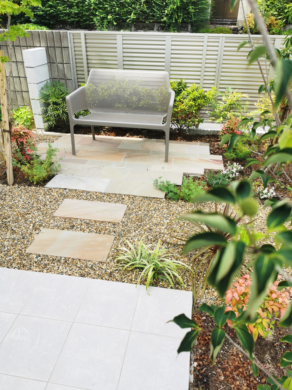 TITLE空に伸びる縦のラインを活かした外構~吹田市 エクステリア 建物の綺麗な縦ライン。それに調和するように縦ラインを強調した門壁にしています。 敷地に高低差があるので、門壁上部にシンボルツリーを配植し、夜間もライトアップして帰宅を迎えてくれます。 階段の幅を広げ、玄関までのアプローチに余裕を持たせるとともに、玄関前のスペースに前庭を作ってベンチを設置し、見ても楽しめる景色、ちょっとしたご近所さんの訪問にも応接できる場所にしています。