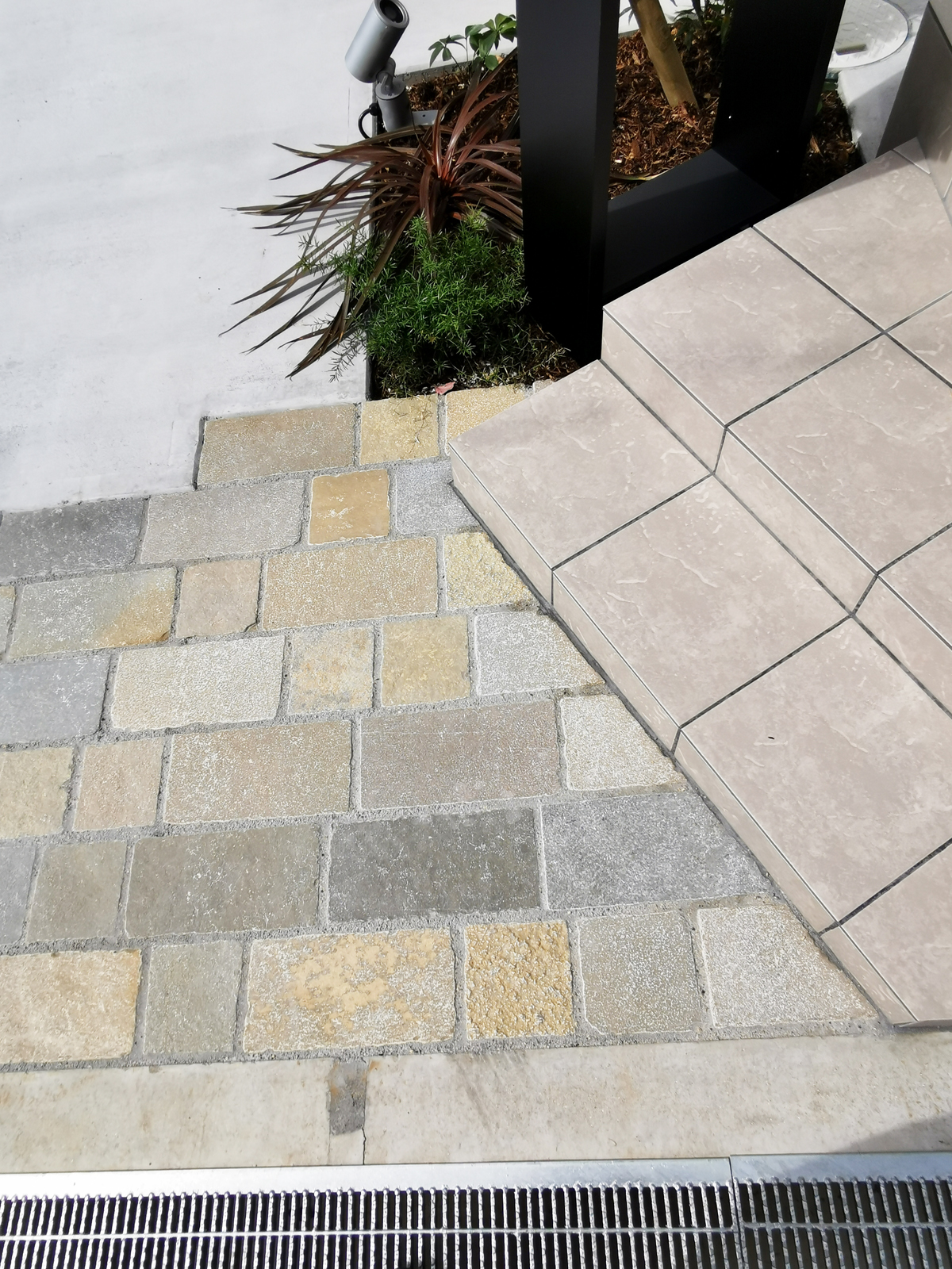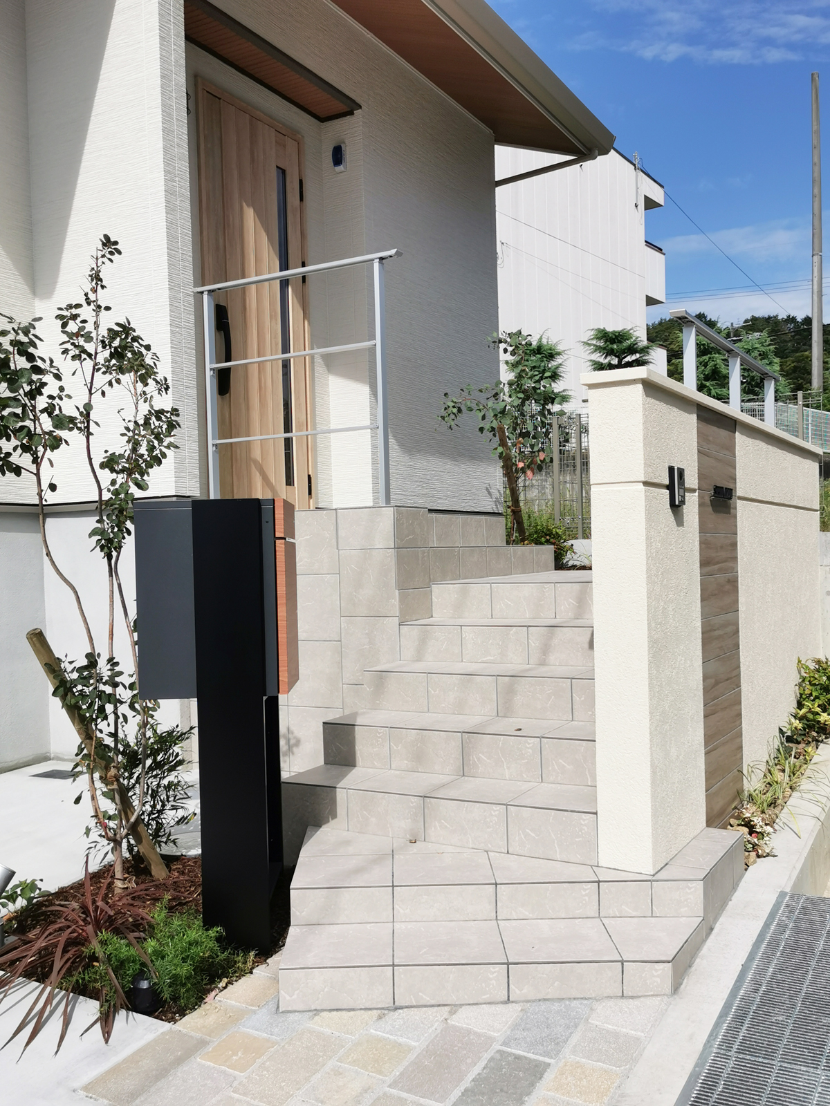 階段1段目の取り方を、道路に対して少し角度を取るのと広く見せるように工夫しています。