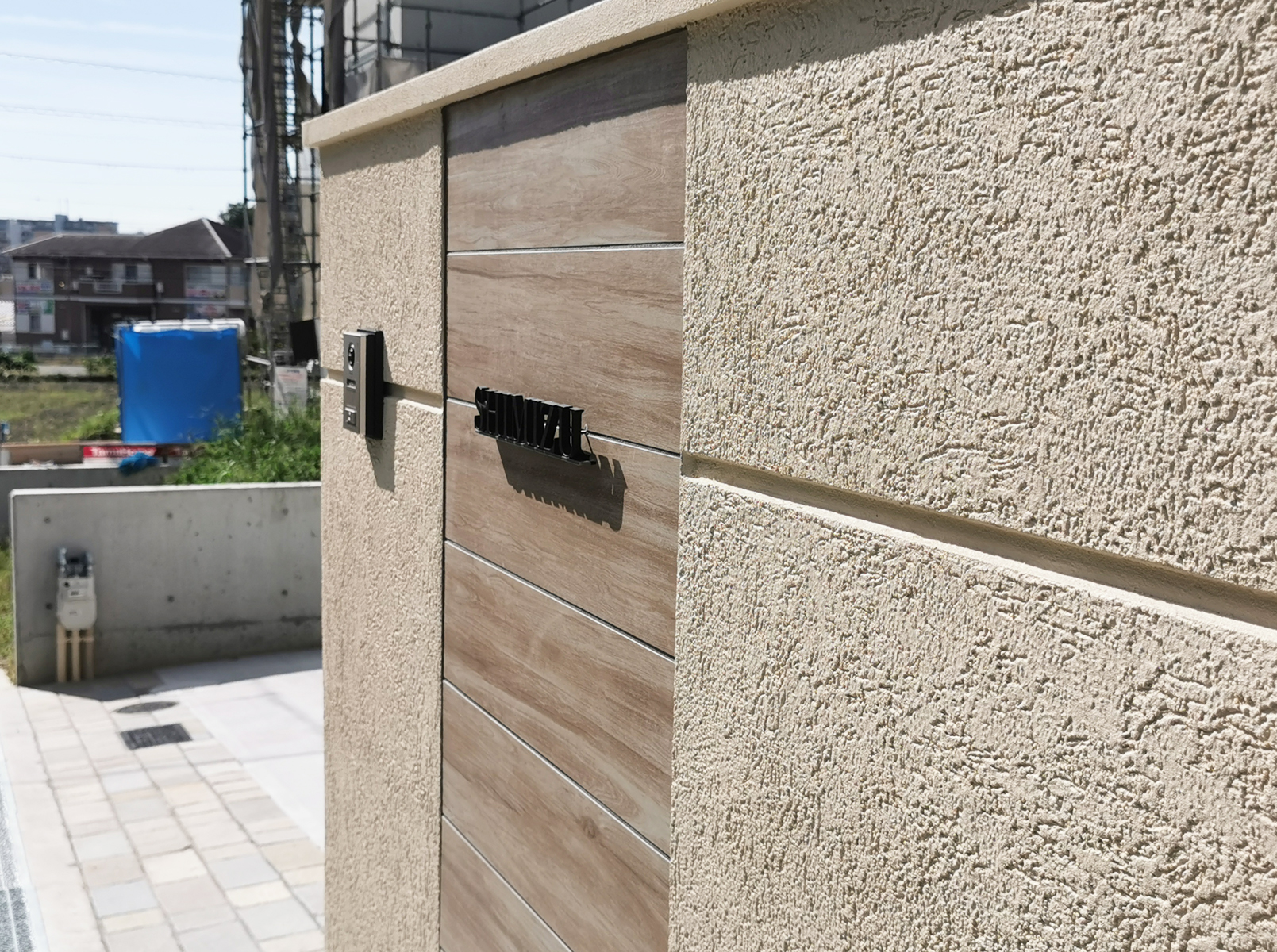 家の1Fと2Fを結ぶ特徴的な凹部分。それに合わせ門壁にも凹部分を設け、建物のドアの色調と合わせたタイルをアクセントタイルにした門壁です。